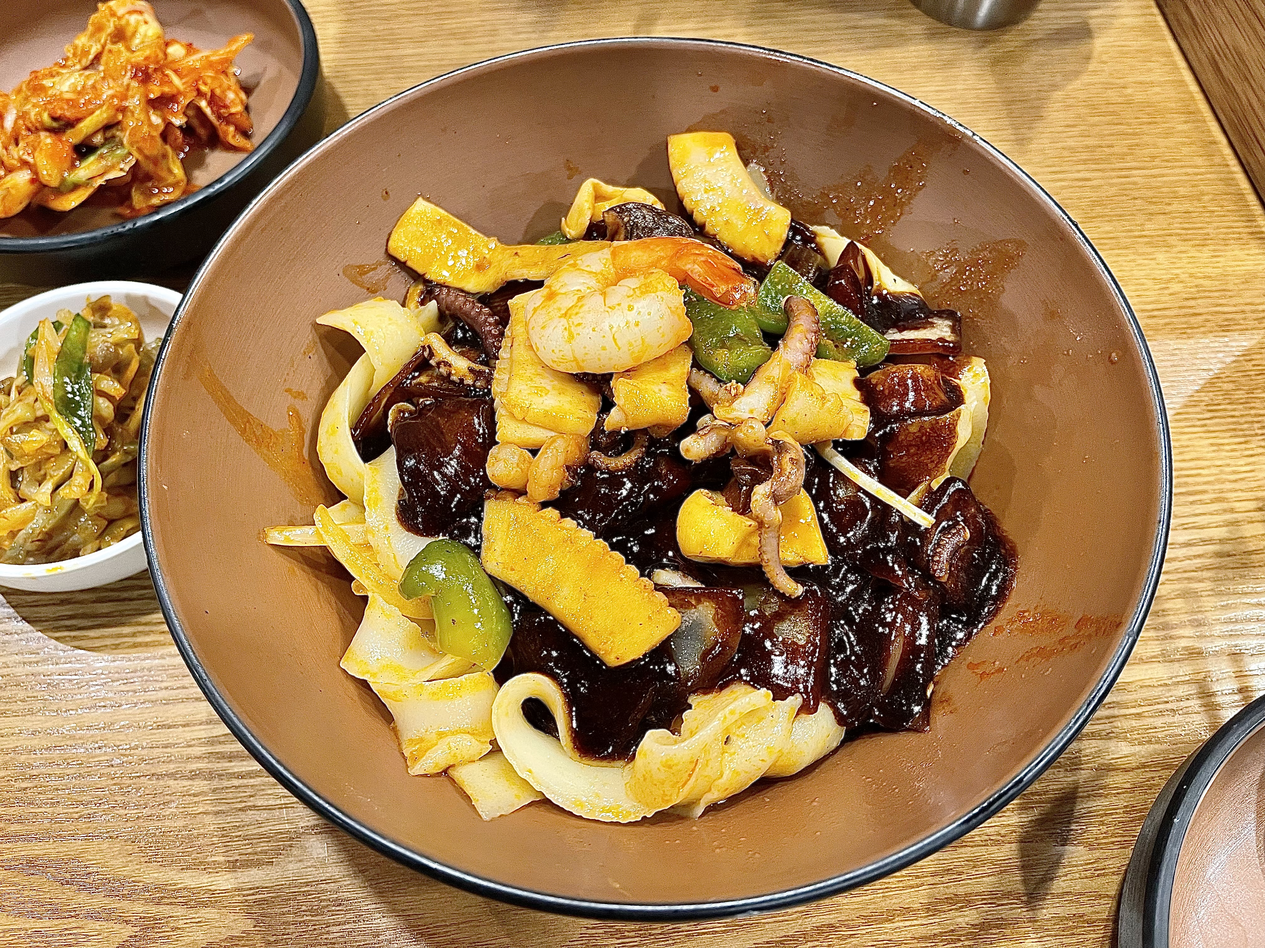 Knife-cut jjajangmyeon with sea foods(삼선해물짜장도삭면)